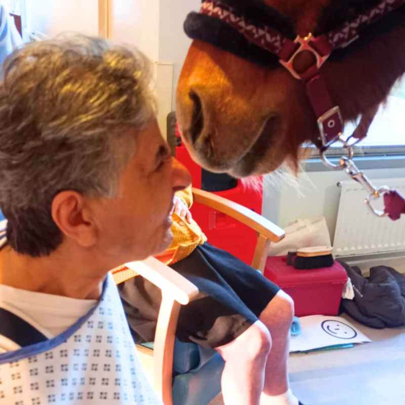 Dans le cadre du DU Ehtique et Prévention dans l’accompagnement de la personne âgée que j’ai suivi, il est souligné l’importance de maintenir et de veiller à l’expression du désir et du vouloir chez les résidents mais souligne parfois la difficulté de cette expressivité en particulier chez les personnes en unité protégée. Je trouve que la médiation animale et en particulier l’équithérapie est une occasion offerte aux aînés car la présence du cheval à l’intérieur fait naître une surprise et un élan vers le contact.