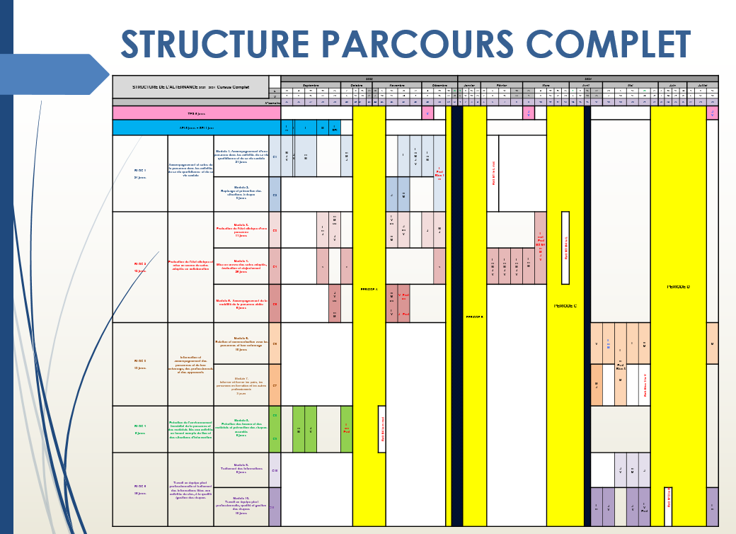 - Période D de 7 semaines : En fin de formation, période intégrative en milieu professionnel, correspondant au projet professionnel et/ou permettant le renforcement des compétences afin de valider l’ensemble des blocs de compétences.
